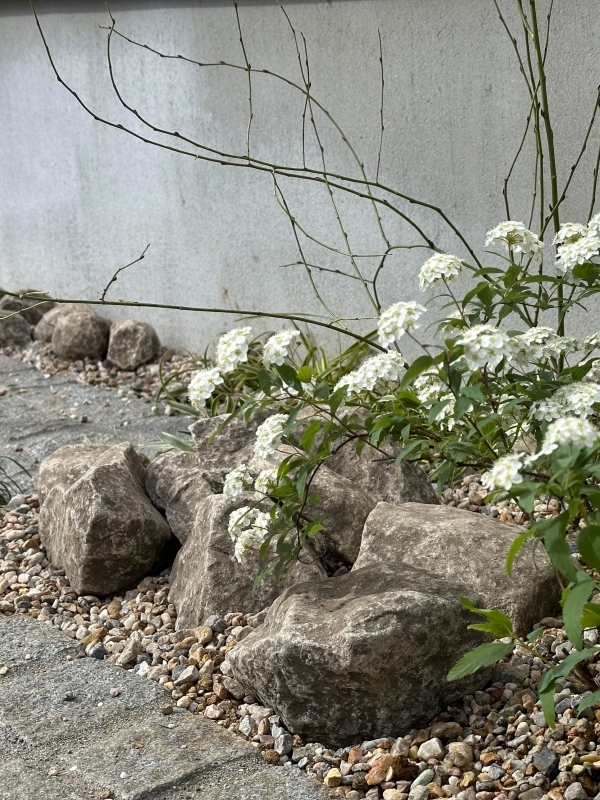 植栽スペースを和風に。ゴロタ石には信州志賀石を。化粧砂利は珪岩(ケイガン)です。小手毬の優雅さが引き立ちます。小手毬の後ろ手にある落葉低木樹は山吹(ヤマブキ)です。これからの季節は新葉を、秋には紅葉を楽しめます。