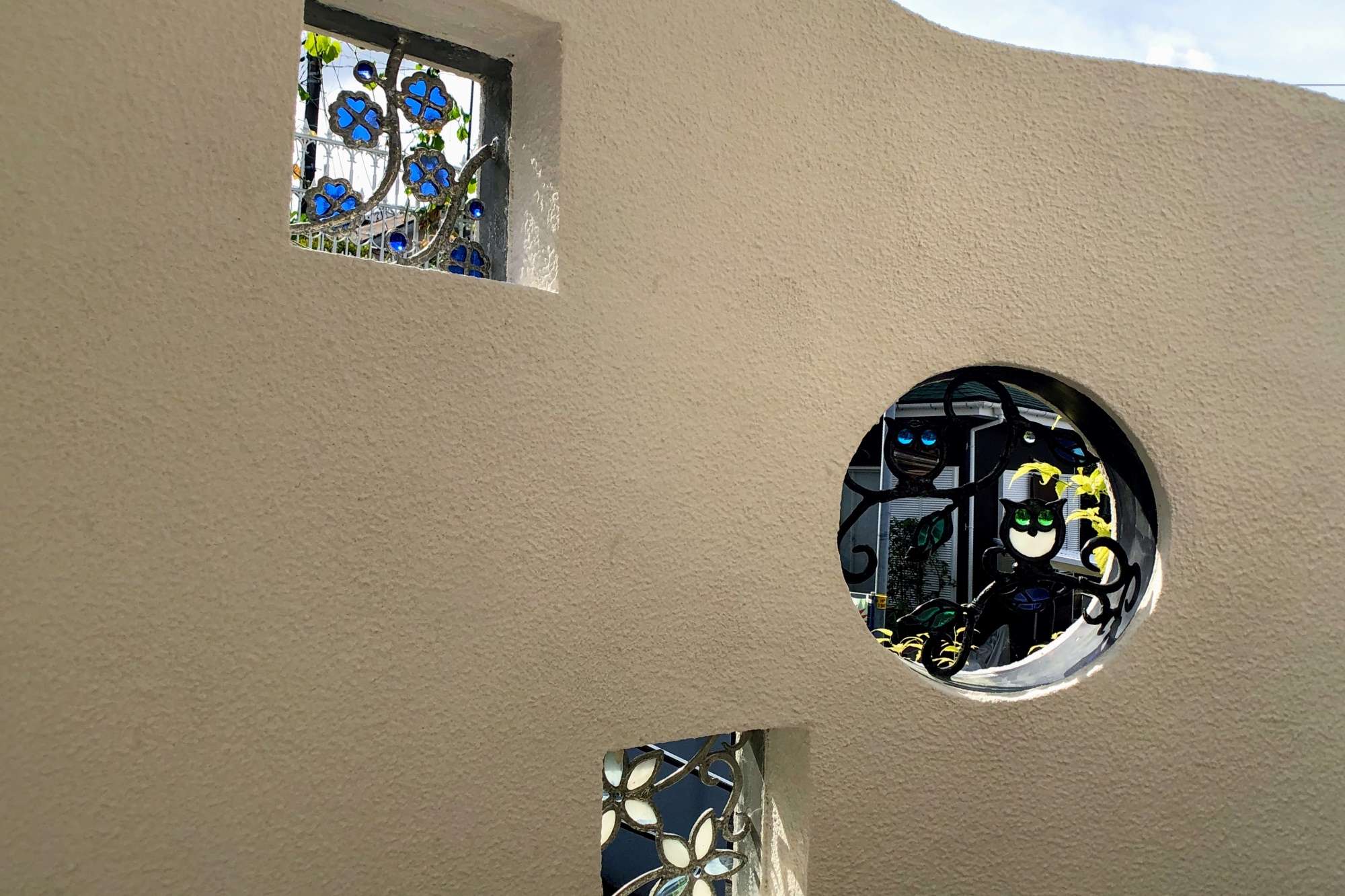 Rの縁には色とりどりのピンコロ石を取り入れ、エントランスの素材と同様にすることで、統一感をだしてあります。
